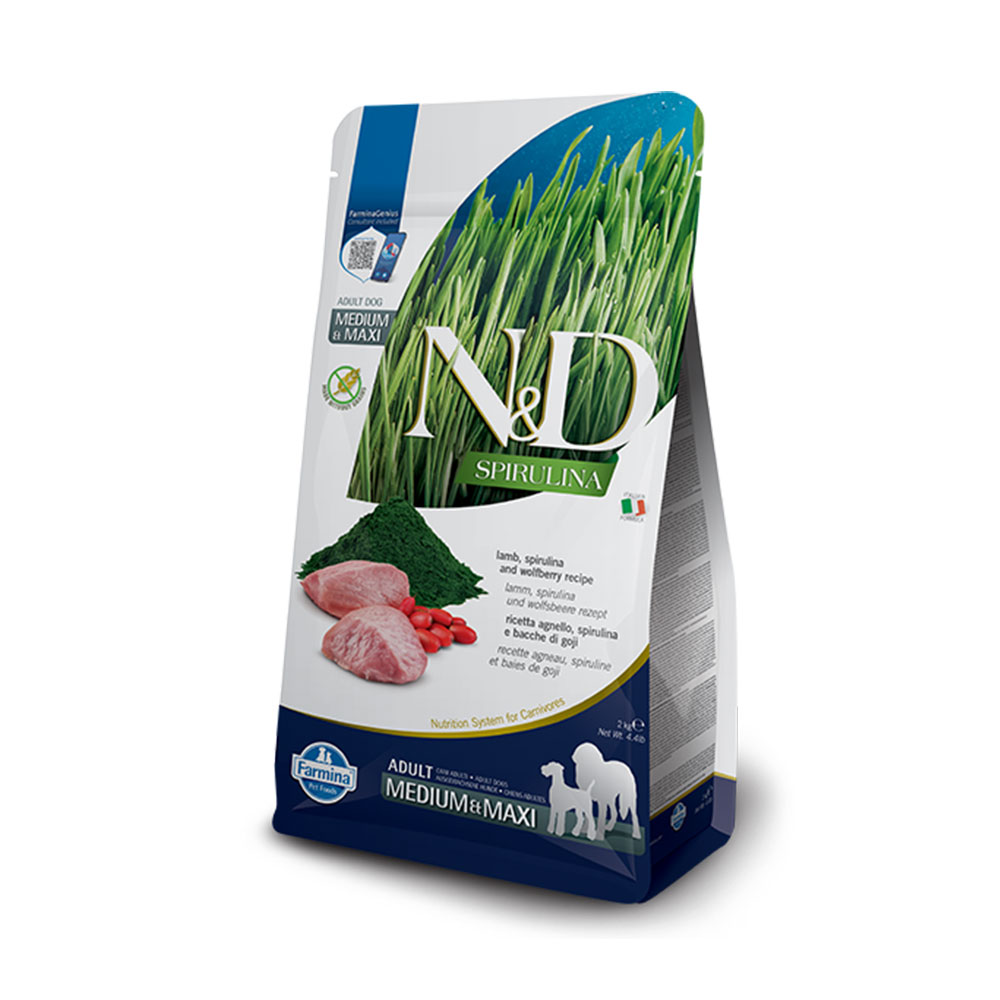 Ricetta agnello, spirulina e bacche di Goji. Alimento completo per cani adulti.