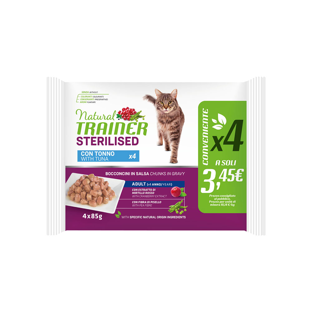 Natural Trainer Sterilised in Salsa da 85g sono 4 bustine da 85 gr di un alimento umido completo per gatti adulti sterilizzati, gatti poco attivi e gatti che trascorrono gran parte del tempo in casa.